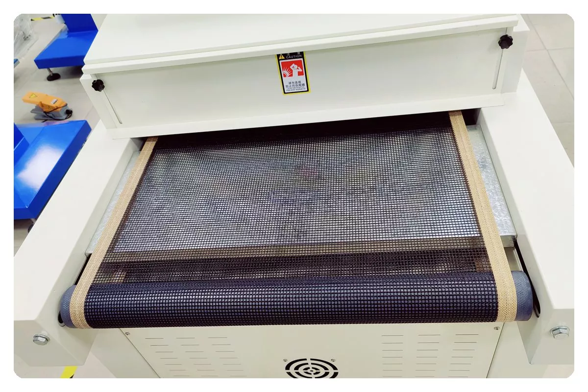 Tekoči trak stroja za UV strjevanje s širino 1000 mm krmili električni motor, njegovo hitrost pa je mogoče prilagoditi glede na zahtevano proizvodno hitrost, da ustreza različnim zahtevam sušenja.