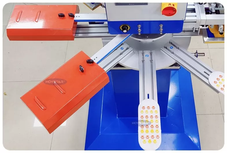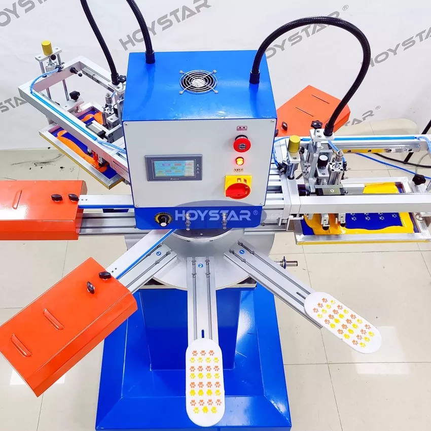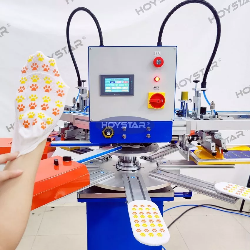 Kot profesionalni proizvajalec in dobavitelj je HOYSTAR High Rapid 2 Colors Socks Screen Printing Machine zasnovan za uporabo v industriji tekstilnega pletenja. S hitrostjo do 1000 kosov/uro je primeren za tiskanje nedrsečih nogavic, nogavic za dojenčke, nogavic za odrasle, nogometnih nogavic itd. Opremljen je z vrtljivo delovno mizo, zato je zelo priročen za nalaganje in praznjenje nogavic. PLC nadzor zaslona na dotik, zelo enostaven za uporabo. Stroj, opremljen s sušilnim sistemom, lahko dobro posuši silicij in črnilo.