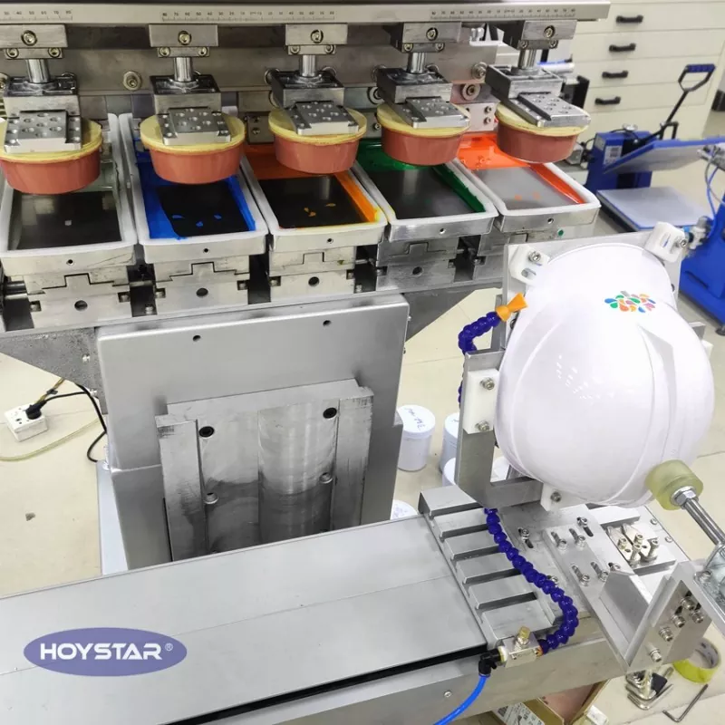 Kot profesionalni kitajski proizvajalec in dobavitelj je 6-barvni tiskarski stroj za varnostno čelado HOYSTAR opremljen z nadzorno ploščo PLC z zaslonom na dotik, enostavnim za upravljanje. Ta stroj je zasnovan za tiskanje na ukrivljene in nepravilne površine, kot so čelade. Ta vsestranski stroj je idealen za vrsto industrij, vključno z varnostno in zaščitno opremo, športno opremo, avtomobilskimi deli, promocijskimi izdelki, elektronskimi ohišji in igračami. In imajo nastavljivo višino mize za različne dimenzije izdelkov.