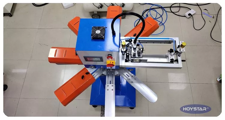 Vrtljiva delovna miza s 5.10 postajami, optimizirana za učinkovitost: 2 postaji za polnjenje/raztovarjanje, 1 postaja za tiskanje, 5 postaj za sušenje. Z 8 postajami, ki delujejo hkrati.