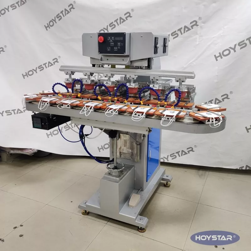 Kot profesionalni proizvajalec na Kitajskem vam želimo ponuditi visoko učinkovit šestbarvni tamponski tiskalnik HOYSTAR s tekočo delovno mizo. Ta stroj omogoča neprekinjen šestbarvni tamponski tisk za izdelke, z eno barvno registracijo, dokončano v enem ciklu. Ta stroj uporablja transportni sistem z vrtljivo mizo, ki omogoča neprekinjen in nemoten prenos izdelka skozi celoten proces tiskanja, zmožnost popolnega 6-barvnega pretiska v samo enem rotacijskem ciklu. V primerjavi s tamponskimi tiskalniki tipa shuttle je njegova hitrost zelo visoka.